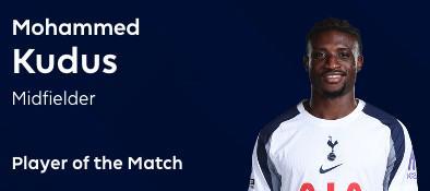 传射建功,库杜斯当选利兹联vs热刺全场最佳球员